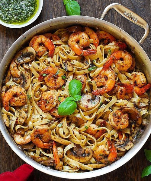 Home Pesto Shrimp Fettuccine in Mushroom Garlic Sauce Pesto Shrimp Fettuccine in Mushroom Garlic Sauce