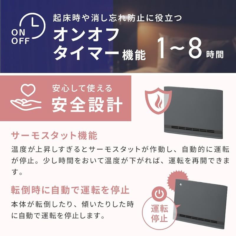 オン/オフタイマー付きで1 ~ 8時間(1時間単位)で設定が可能なので寝る前などに時間設定をしてご使用いただけますので節電対策にもなります。また、安全にご使用いただける温度ヒューズ、サーモスタット、転倒時自動オフスイッチの安全装置付き。